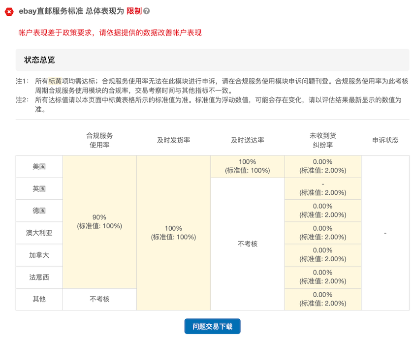 本接口对应“政策表现”>“直邮服务标准” >“考核表现” 中的数据。卖家中心相关界面供参考: