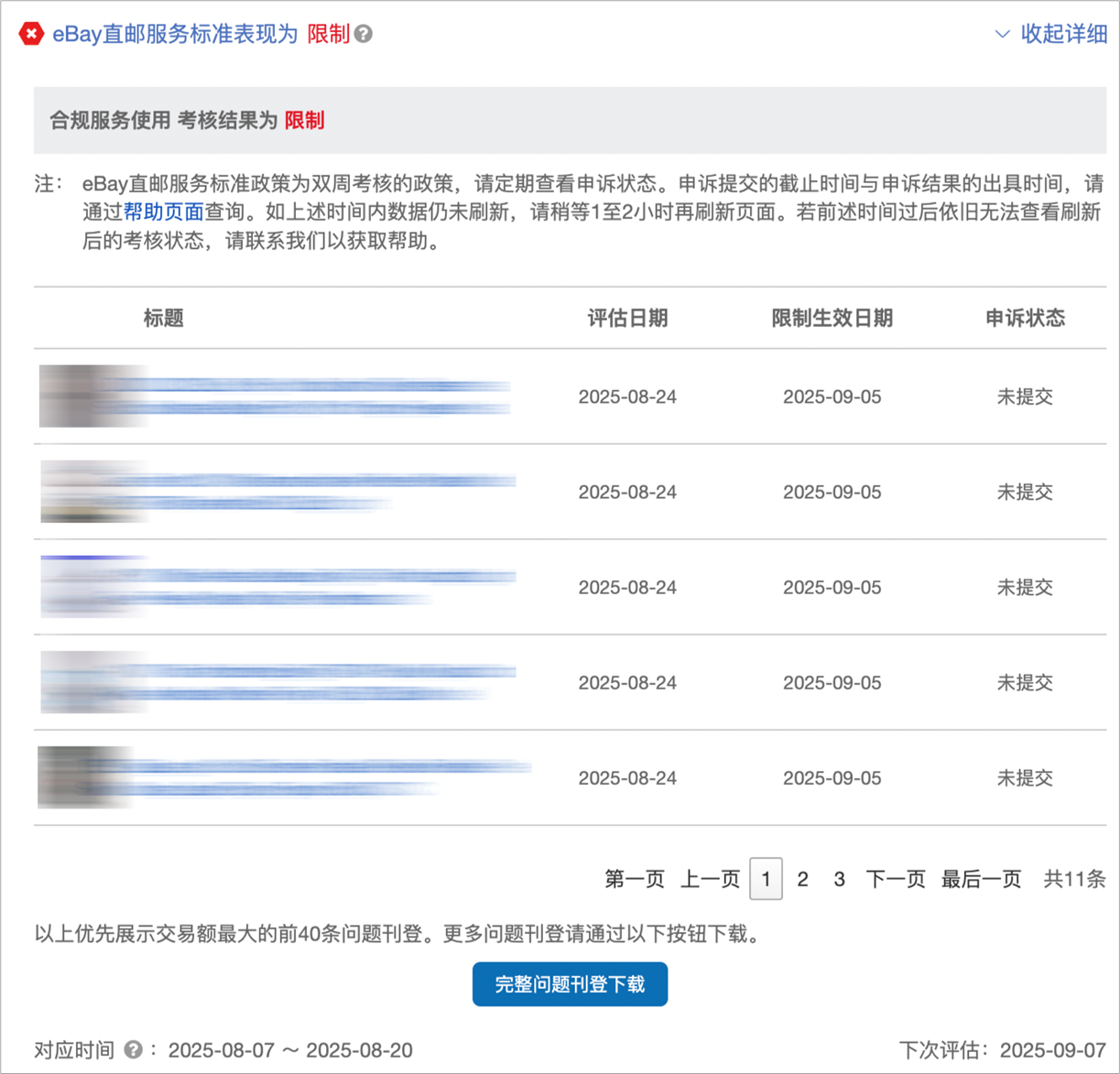 发布时间:2025-10-15 最近刷新时间:2025-10-15本接口对应“政策表现”> “物流服务标准” >“eBay直邮服务标准” >“合规服务使用考核结果” 中的数据。 卖家中心相关界面供参考: