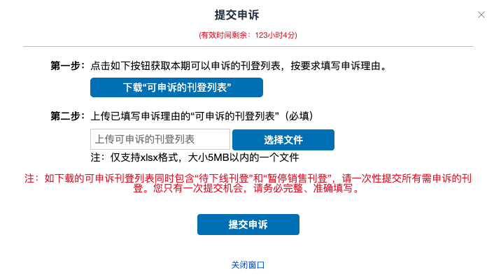 ● 提交。请在倒计时完成前提交,注意提交后的申诉不可修改。(如下载的可申诉刊登列表同时包含“待下线刊登”和“暂停销售刊登”,请一次性提交所有需申诉的刊登。您只有一次提交机会,请务必完整、准确填写。)