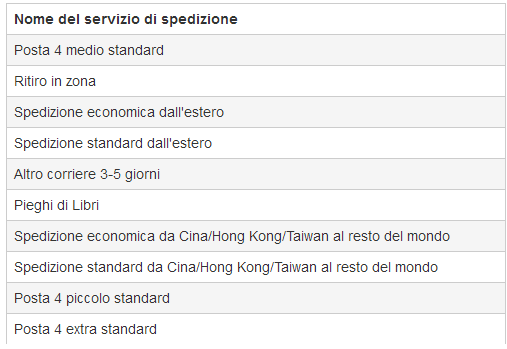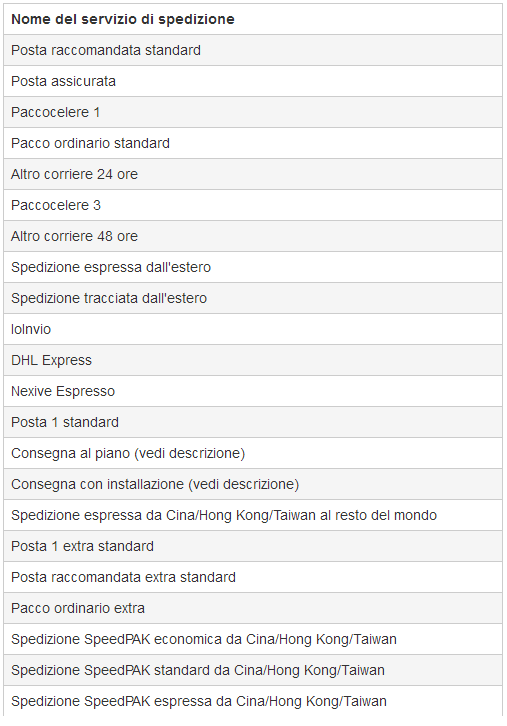 以下为ebay.it上提供的有无物流跟踪服务的承运人详细列表。